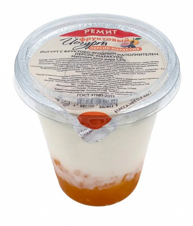 - 👍 Приобрести Йогурт фруктовый слоеный, 1,5% (Персик-Маракуйя) 350гр. можно в наших фирменных магазинах в Москве и Московской области.